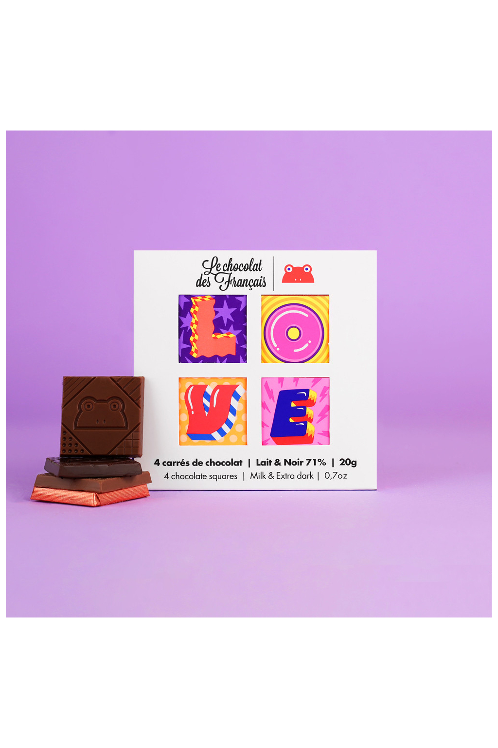 Zamilujte se do nejroztomilejší krabičky LÁSKY složené ze čtyř malých organických čokoládových čtverečků. Jemné mléčné a extra hořké 71 %.